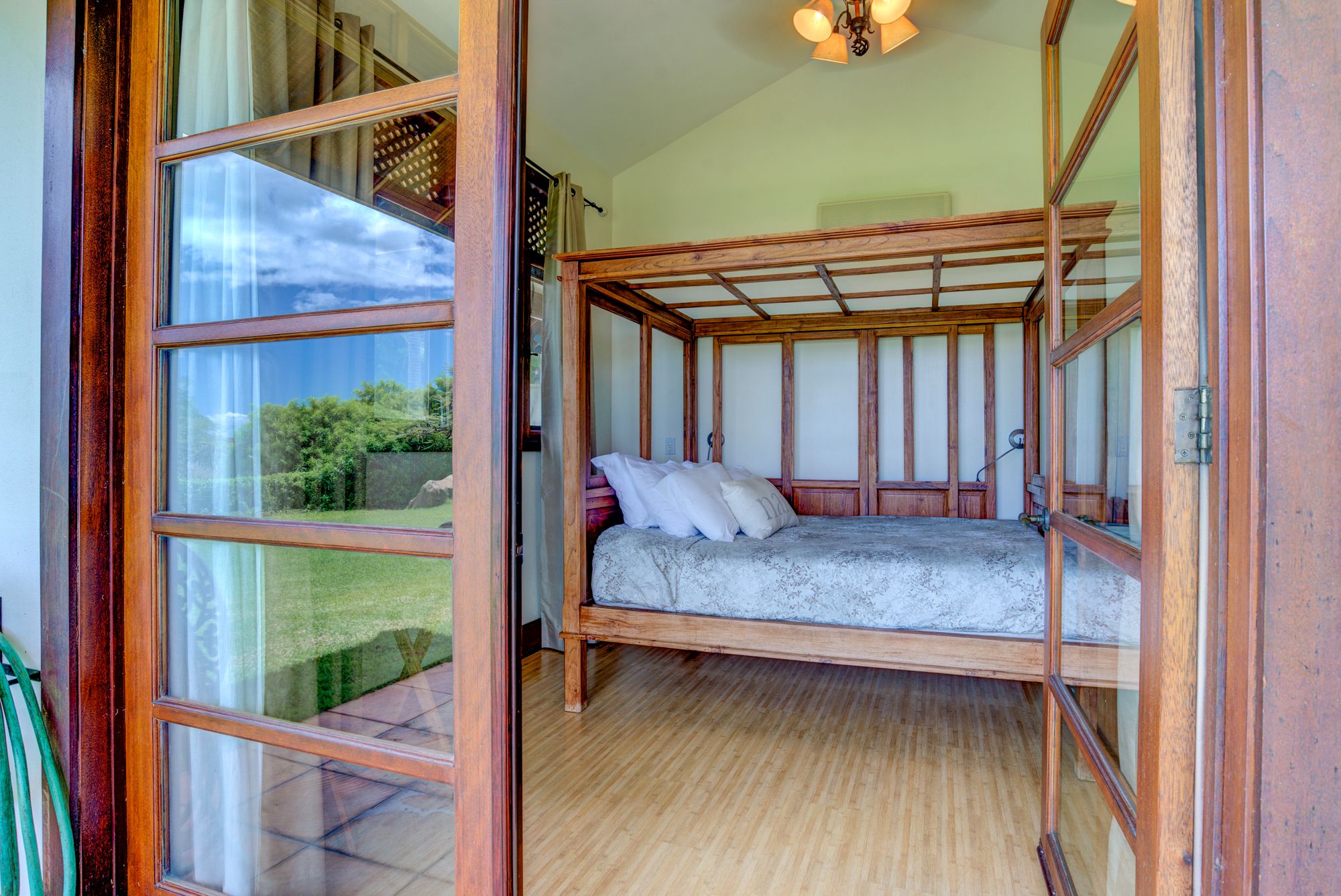 Nalu (nah-loo) ‘Wave’ in Hawaiian. From your private lanai and your gorgeous antique queen size Chinese Wedding Bed, this ocean view room allows you to watch the Pacific. Enjoy the boats and maybe a few whales as they jump and spray. As you walk into this room, you’ll step onto the Toba marble floor, and straight ahead you’ll find the custom one-piece seashell stone bathtub with matching vanity and sink. The outdoor shower, with its Ivorystone walls and bamboo showerhead, again offers unbelievable ocean views. Nalu will be your romantic home away from home.